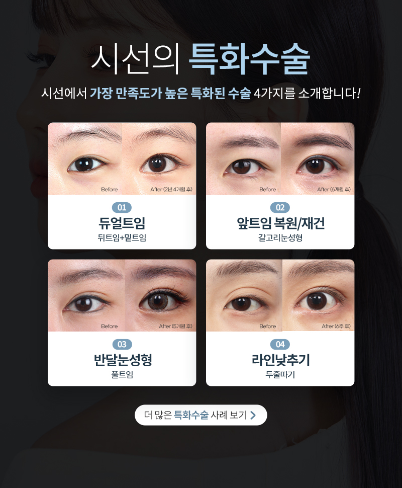 눈 재수술은 이전 수술의 만족스럽지 못한 부분이나 부작용으로 인한 불편함을 개선하는 수술입니다. 이런 재수술은 흉터조직의 유착과 손상 정도를 고려하여 시행해야 하며, 실패의 원인을 꼼꼼하게 파악하여 심미적인 문제와 기능적인 문제를 동시에 개선해야 하므로 전문의에게 받는 것이 바람직합니다. 눈 재수술 경험이 풍부한 성형외과 전문의입니다. 눈 재수술의 대상자는 누구인가요?