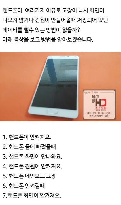 사실 요즘 휴대폰이 워낙 대중화되다 보니 방수는 기본 기능인 줄 알고 처음에는 별로 속상하지 않았습니다. 헤어드라이어로 잘 말린 뒤 전원을 켜면 저절로 효과가 나올 줄 알았는데, 많은 분들이 그렇게 하십니다. 몇 시간이 지나도 버튼을 아무리 눌러도 화면이 반응하지 않았습니다. 그때부터 휴대폰에 남겨두었던 중요한 데이터들이 하나둘 떠올라 불안해지기 시작했다.