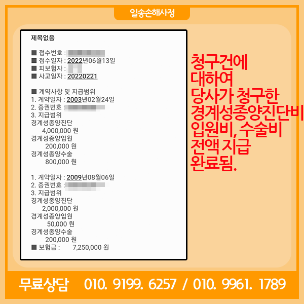 보험계약일자가 2008년 이전이고 생검결과가 성숙기형종이고 진단명이 “양성난소종양”이며 질환분류코드가 D27.0/D27.1/D27.9인 경우 구체적인 사정에 따라 경계성종양진단에 대한 보상을 받을 수 있으니 상담을 받으시길 권해드리며, 살펴보시고 필요하시면 언제든지 연락주시기 바랍니다.