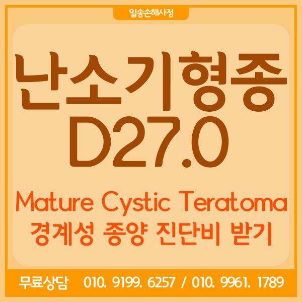 그렇다면 위 중 하나로 진단된다면 경계성 종양진단비를 청구할 수 있나요? 먼저 보험약관에 종양경계진료비 지급사유로 명시된 질병분류코드는 D37~D48 사이여야 하는데, D27.0/D27.1/D27.9는 모두 양성종양코드로 이 범주에 속하지 않는다. 또한 난소성숙기형종은 현재 ‘양성종양’으로 분류되어 있어 현행 진단기준으로는 경계선종양진단비를 지급받을 수 없다. https://mblogthumb-phinf.pstatic.net/MjAxNzAyMjBfNDMg/MDAxNDg3NTc2NzQzNTIw.r65WG9e9cDaCInYZOgYrfKEMWJOIOPVXUanA9B7UbOog.SGXeOG-XkpR53VIvBi-f-Jf7FABL8BW4gdMf R3AWxMUg .JPEG.wjdth0/1487576679049.jpeg?type=w800