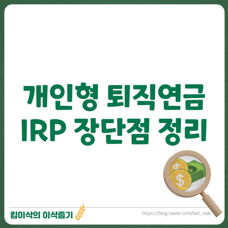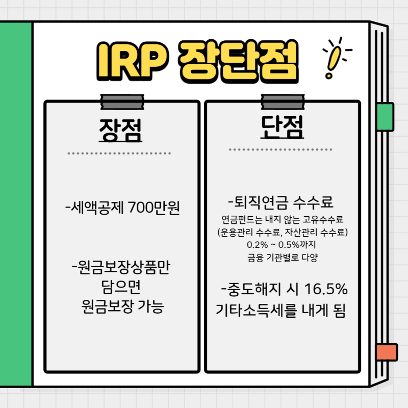 지난 포스팅에서는 IRP 계좌 개설 및 해지 방법과 연금저축과의 차이점에 대해 알아보았습니다. 오늘은 IRP계좌의 장점과 단점에 대해 자세히 알아보겠습니다! 1. IRP의 장점